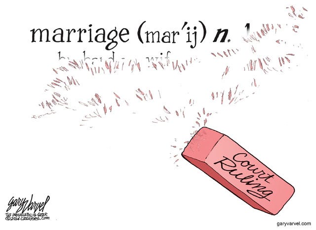 The cartoon (above) was drawn after a lower court ruled in favor of same-sex marriage. The following year, the Supreme Court made it a new right and erased the definition of marriage.